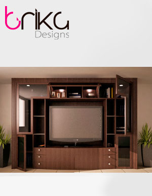 Centro De Entretenimiento, con espacios de almacenamiento, tipo repisas, gavetas con haladores de uñeros. Fabricado en madera solida y enchapado, con diseño en puertas.