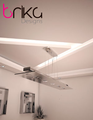 Techo fabricado en mdf, iluminación indirecta con ojos de buey segun diseño y lámparas colgantes.